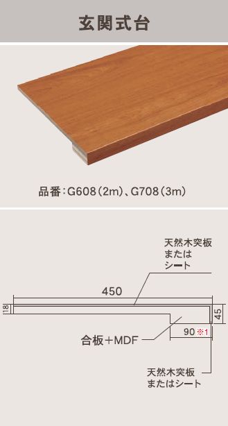 仕様名称 玄関式台 寸法(mm) 1,950×45×450 定価(税込) 42,020円表面材 天然木突板またはシート 基 材 合板+MDF