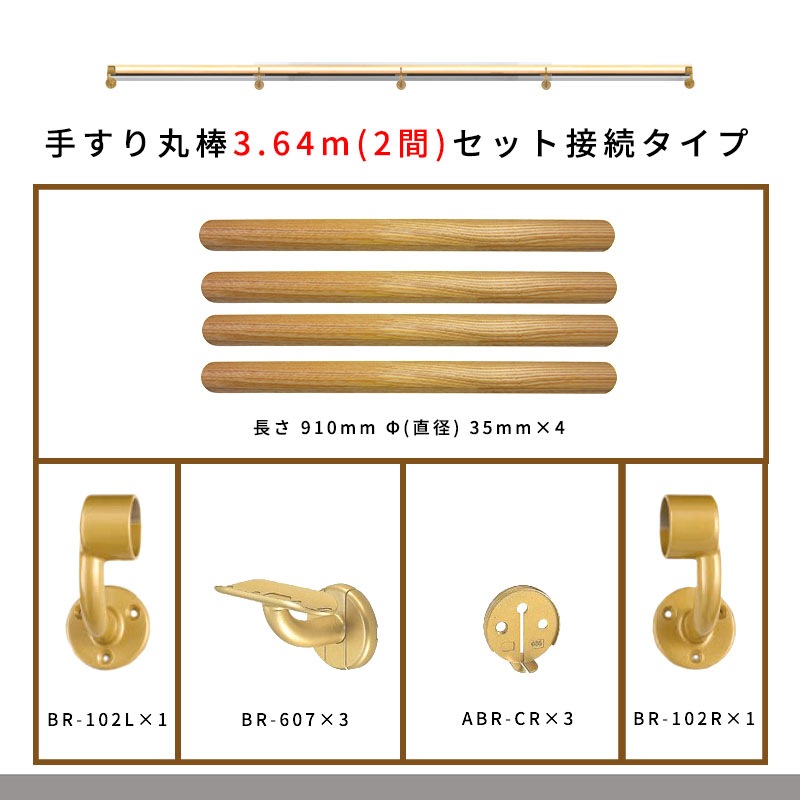 3.64m(2間) 木製手すり丸棒セット接続タイプ(丸棒910mmφ35mm4本・[BR-102L]1個・[BR-102R]1個・[BR-607]3個・[ABR-CR]3個)