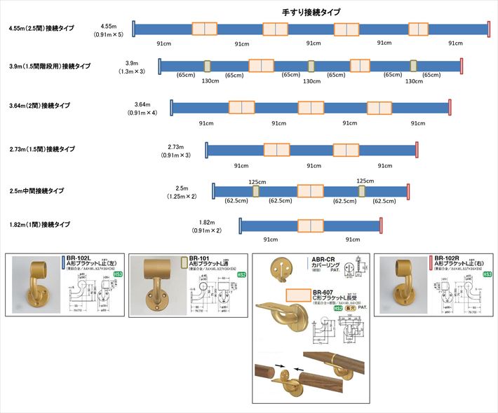 柱の位置が半間の91cmと金具との距離が最大91cmなことから、運びやすい長さの91cmタイプのセット品を作りました。柱の位置が1カ所わかれば、半間ごとに柱があるという前提で考えたセット品です。接続金具と壁取付金具が一体化した合理的な金具を使いましたので、運びやすくて、お手頃価格なセット品です。
